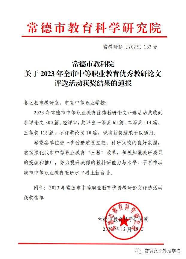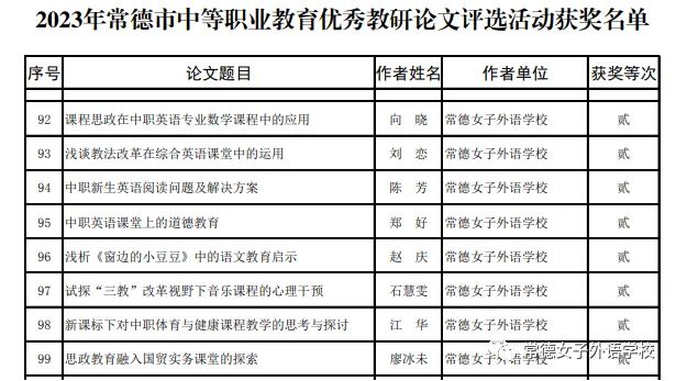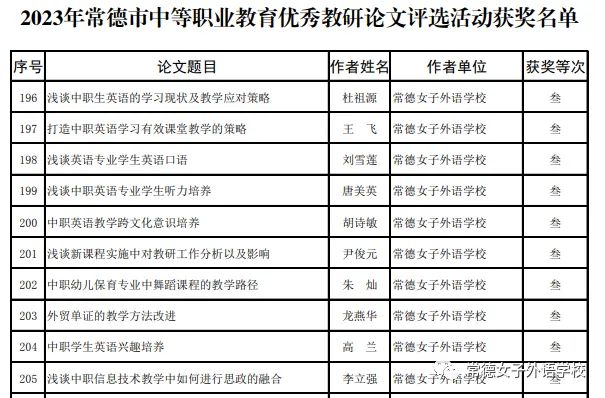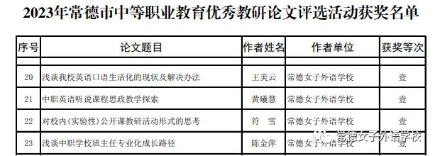 提燈引路化春泥,桃李不言自成蹊。在常德女子外語學(xué)校這片教育沃土上,老師們言傳身教,用人格魅力感染學(xué)生,用理想信念塑造學(xué)生,用先進(jìn)理念引領(lǐng)學(xué)生,涌現(xiàn)出一大批優(yōu)秀教師。在2023 年常德市中等職業(yè)教育優(yōu)秀教研論文評選活動(dòng)中,常德女子外語學(xué)校教師再展風(fēng)采,喜獲佳績!王美云、黃曦慧、符雪、陳金萍四位老師獲一等獎(jiǎng);向曉、劉戀、陳芳、鄭好、趙慶、石慧雯、江華、廖冰未八位老師獲二等獎(jiǎng);杜祖源、王飛、劉雪蓮、唐美英、胡詩敏、尹俊元、朱燦、龍燕華、高蘭、李立強(qiáng)十位老師獲三等獎(jiǎng)。在此向全體獲獎(jiǎng)教師表示祝賀,并向全體師生報(bào)喜!